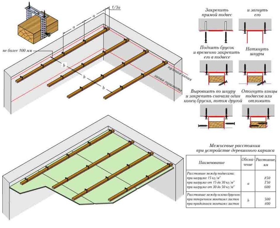 После того, как все бруски закреплены, можно приступать к крепежу оставшихся частей обрешетки, делать это нужно так, чтобы гвл располагались поперек обрешетки. Стоит отметить, что, если расстояние не превышает толщины самой деревянной детали, то крепеж можно осуществить прямо к основанию базы. Если же ситуация обратно, то нужно будет для начала установить подвесы, применив дюбели, а только после этого прикрепить к подвесам деревянные элементы с помощью саморезов.