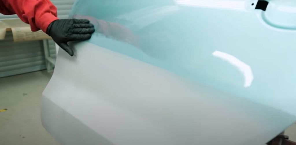 Загрунтованный участок автомобиля полностью высох. Перед тем как приступить к шлифованию, убираем маскировку и оцениваем результат. Граница перехода получилась очень плавной, без жесткой отсечки. Всё правильно. Именно так, как и должно быть.
