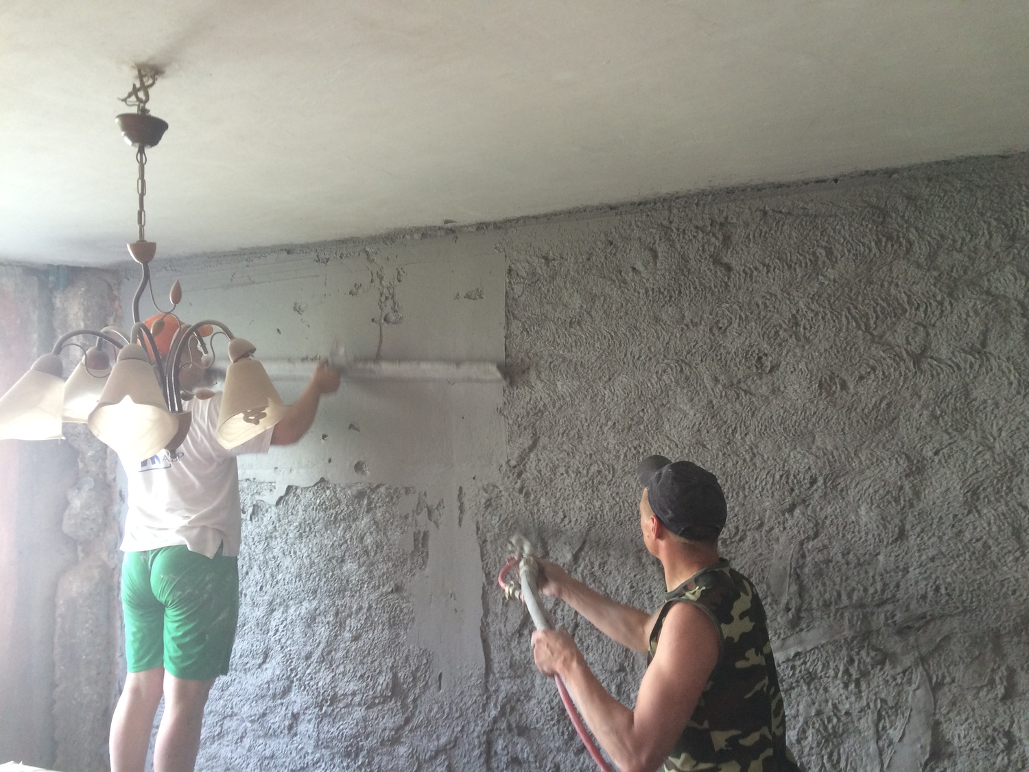 Его так и оставляем “буграми”. Накидывают как можно чаще. Начинают снизу стены и двигаются вверх.