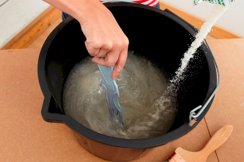 Приготовление клея требует выполнения определенной последовательности действий. Сначала теплую воду заливают в емкость, а затем постепенно засыпают сухой состав до получения нужной консистенции. Спустя несколько минут раствор перемешивают, ликвидируя комочки, и доводят до однородности.