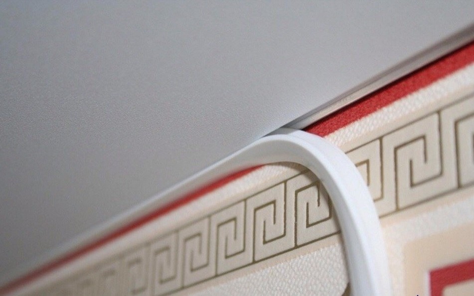 Основная сложность заключается в сохранении целостности натянутой пленки. Учитывая, что это достаточно тонкий материал, выполнять все работы следует очень аккуратно. Начинают с демонтажа плинтуса, закрывающего монтажные швы потолка. Его поддевают плоским инструментом и вынимают из пазов. Тогда можно будет завести обойное покрытие под крепление и закрыть некрасивый шов плинтусом.