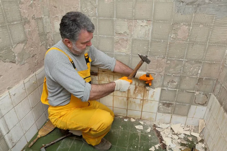 Процесс снятия кафельной плитки с гипсокартона в ванной