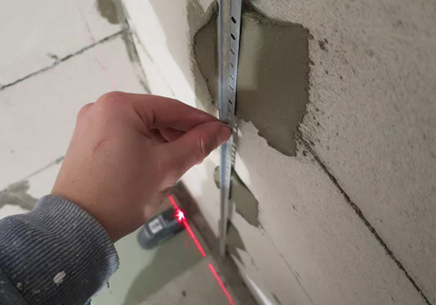 - Длинным правилом или жесткой рейкой проведите вдоль стены, найдя самый выпуклый е участок (исходная точка), к нему для образования вспомогательной плоскости необходимо прибавить 0,5 см на слой штукатурки;