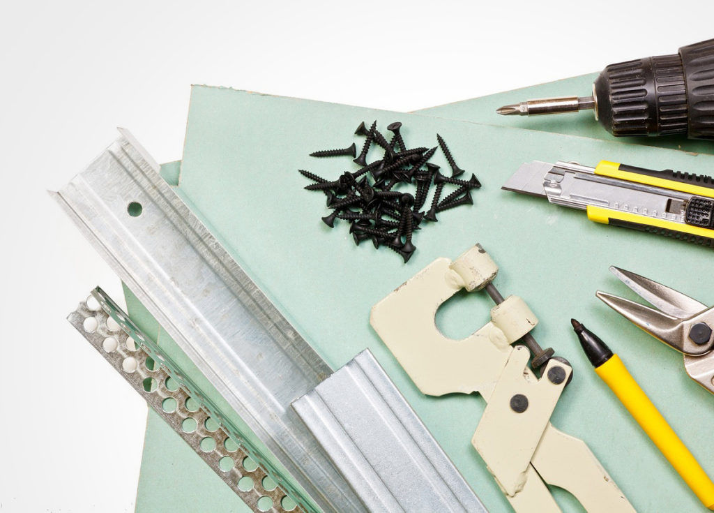 Без инструментов невозможно ничего сделать. Даже если есть подручные средства, их будет недостаточно для работы с гипсокартонными листами. Как всё-таки сделать скрытый карниз для штор из гипсокартона?