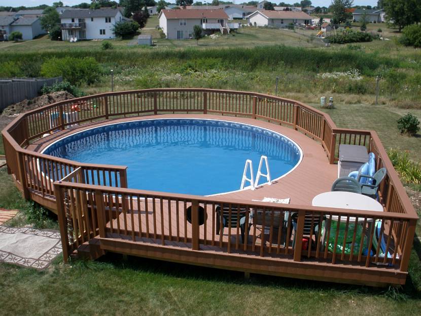 На дачном участке можно установить личный бассейн разного объема. В дальнейшем его зону ограничивают террасной доской, устанавливают лежаки и шезлонги