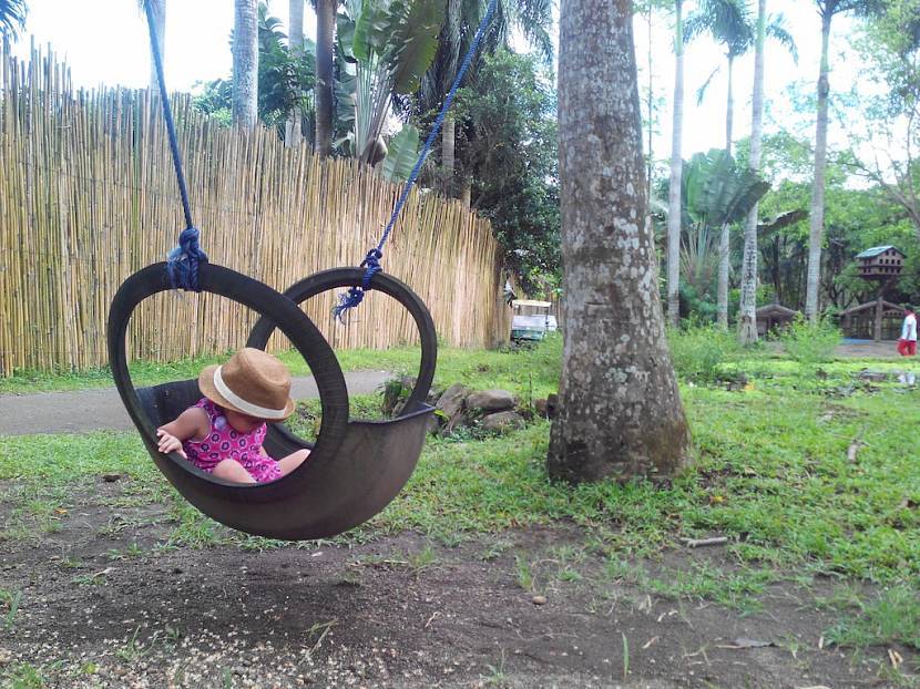 Удобной будет качели из автомобильных покрышек. Таких изделий можно выполнить несколько. Нужно просто вырезать два кольца по бокам, сформировать спинку и вывернуть шину наизнанку. Армированные кольца полностью не срезаются, они послужат ручками для крепления к дереву или перекладине. Разукрасьте приспособление краской — порадуйте ребенка.