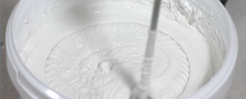 Выполняем ещё один этап — «супефинишное» выравнивание шпаклевкой КНАУФ-Ротбанд Паста Профи. Материал не надо затворять – это уже готовый к нанесению состав. Перед использованием тщательно перемешиваем шпаклёвку миксером прямо в ведре до однородной консистенции. При необходимости добавляем немного воды (см. инструкцию на упаковке), обороты держим минимальные. Если у Полимер Финиш средний размер зерна – 50 микрон, то у Ротбанд Паста Профи – 25 микрон, вдвое меньше. Поэтому используя Ротбанд Пасту Профи, получить гладкую поверхность легче и быстрее.