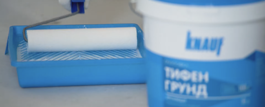Дожидаемся полного высыхания оштукатуренной стены и грунтуем её составом КНАУФ-Тифенгрунд.