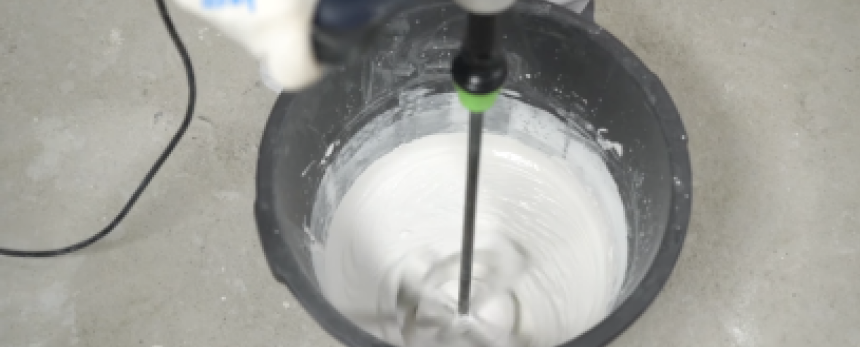 Учитываем такие нюансы: после засыпания в ведро смесь надо размешивать не сразу, а оставить на 2-3 минуты. Перемешиваем смесь два раза: 1 раз на малых оборотах (до 300) в течение 3-5 минут. Затем выдерживаем смесь (даем настояться) не менее 10 минут (вдвое больше, чем у Ротбанда). И затем опять перемешиваем до получения однородной массы, без комочков.