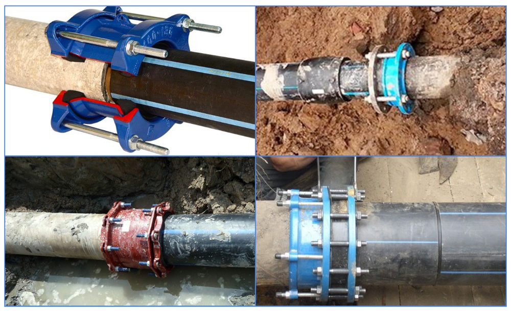 При этом варианте крепежа полимерных и металлических труб используются специальные разъемные приспособления – фланцы и хомуты. Они не только позволяют создать прочный стык, но и дают возможность доступа к месту соединения труб (для этого достаточно открутить болты).