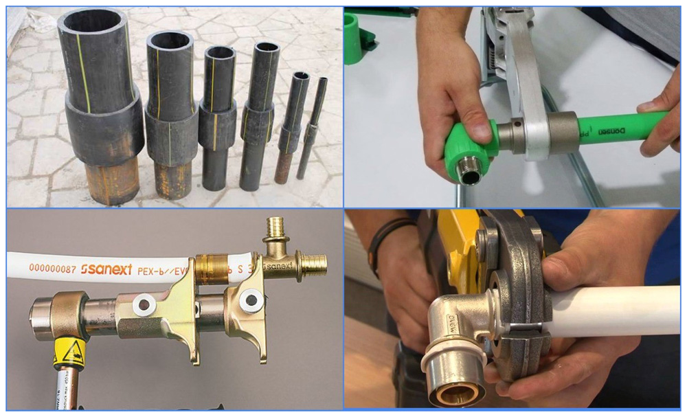 Опрессовка. Переходной металлический фитинг с уплотнительными кольцами или ребрами в виде елки вставляют внутрь трубы, сверху на трубную оболочку одевают гильзу, которую затем сдавливают специальным инструментом, прижимая внутренний штуцер к стенкам трубы. Ответная металлическая деталь может иметь любую форму и наружную или внутреннюю резьбу, американку – ассортимент опрессуемых фитингов весьма широк.