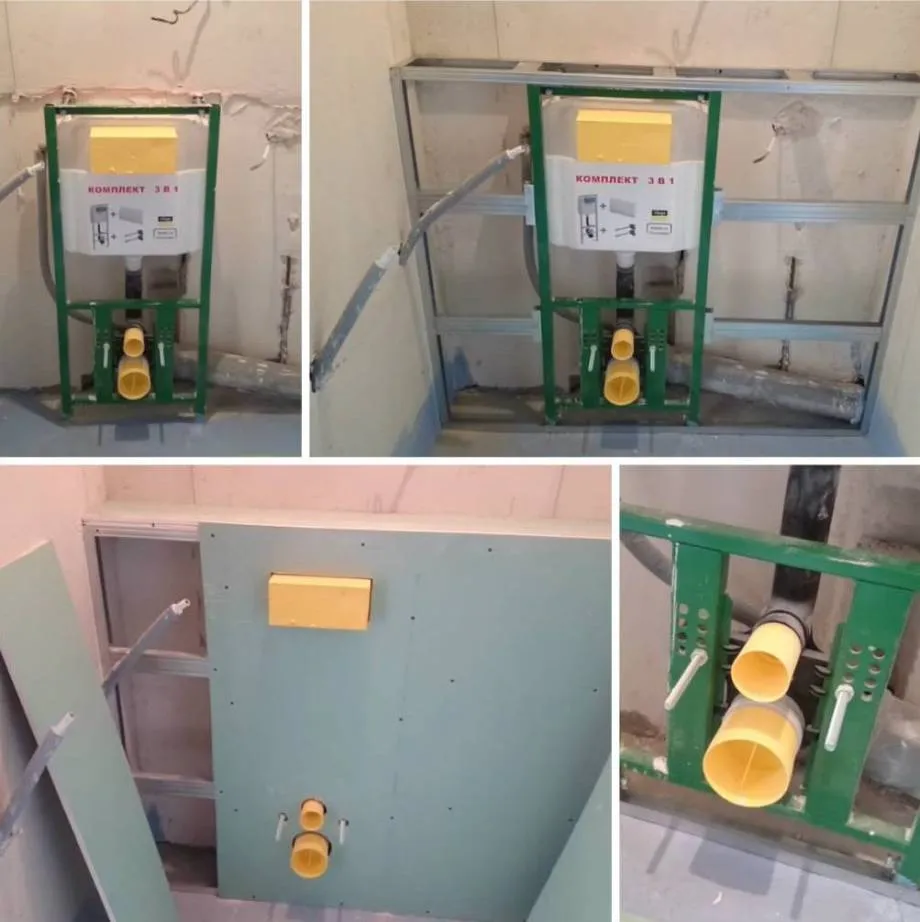 Затем вырезается окошко для панели с кнопками. Далее можно приступать к обшивке инсталляции и установке унитаза на инсталляцию.