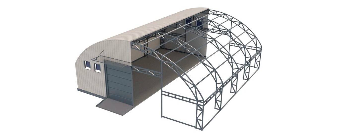 В качестве каркаса таких арочных ангаров используется комплект дугообразных сварных ферм, которые соединены между собой поперечными прогонами, закрепляемыми при помощи болтовых соединений (использование болтов позволяет при необходимости разобрать ангар и возвести его в другом месте). Дуги устанавливаются на расстоянии относительно друг друга около 3 метров. В качестве материала для изготовления дуг используется профильная труба прямоугольного сечения, которая дополнительно покрывается специальными составами, предотвращающими коррозию. Для того чтобы получить максимально качественный металлокаркасный арочный ангар, используется компьютерное моделирование, позволяющее учесть не только нагрузку на фундамент, но и снеговые, ветровые нагрузки, а также нагрузки, сообщаемые тельфером.