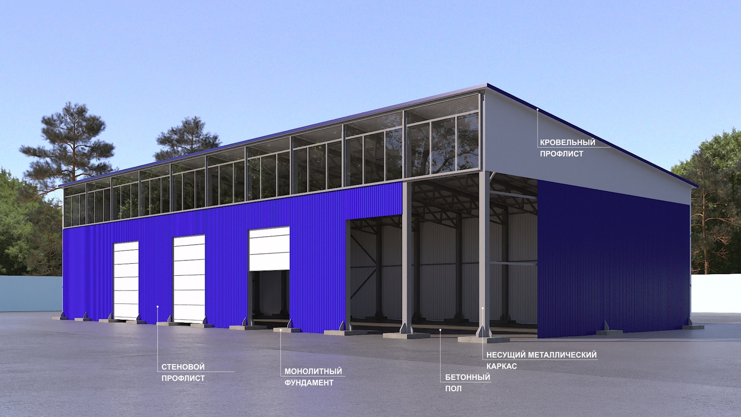 Рассмотрим самостоятельное возведение ангара на примере ангара с покрытием из профилированного листа.